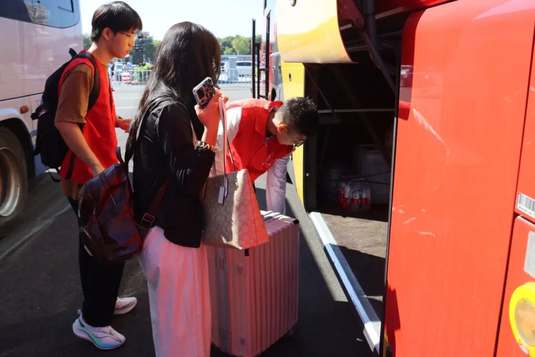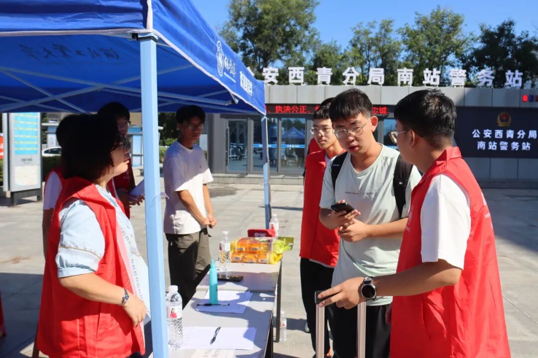 为确保新生入校便捷安全,学校在火车站、机场立岗,志愿者微笑相迎,举牌引路,提箱帮忙。大巴直达学校,温暖一路相伴。