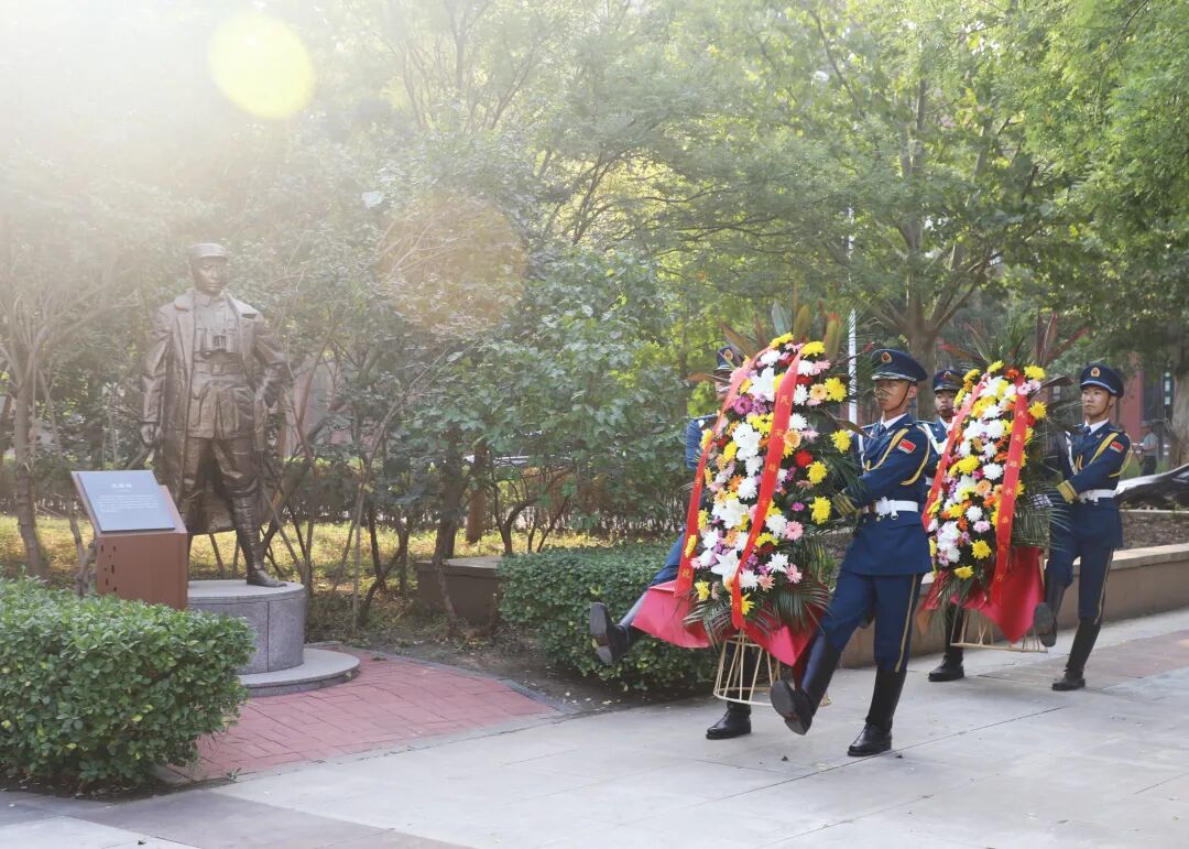 在抗日英烈雕塑前,师生代表奏唱国歌,对英魂致以崇高敬意。蓝天国旗护卫队向烈士敬献花篮。