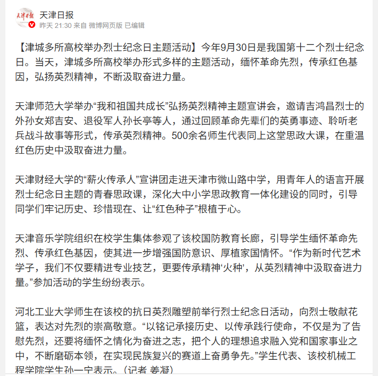 9月30日,《天津日报》在其微博客户端发布报道“津城多所高校举办烈士纪念日主题活动”,其中新葡萄师生在校内抗日英烈雕塑前举行了纪念活动,深切缅怀革命先烈。